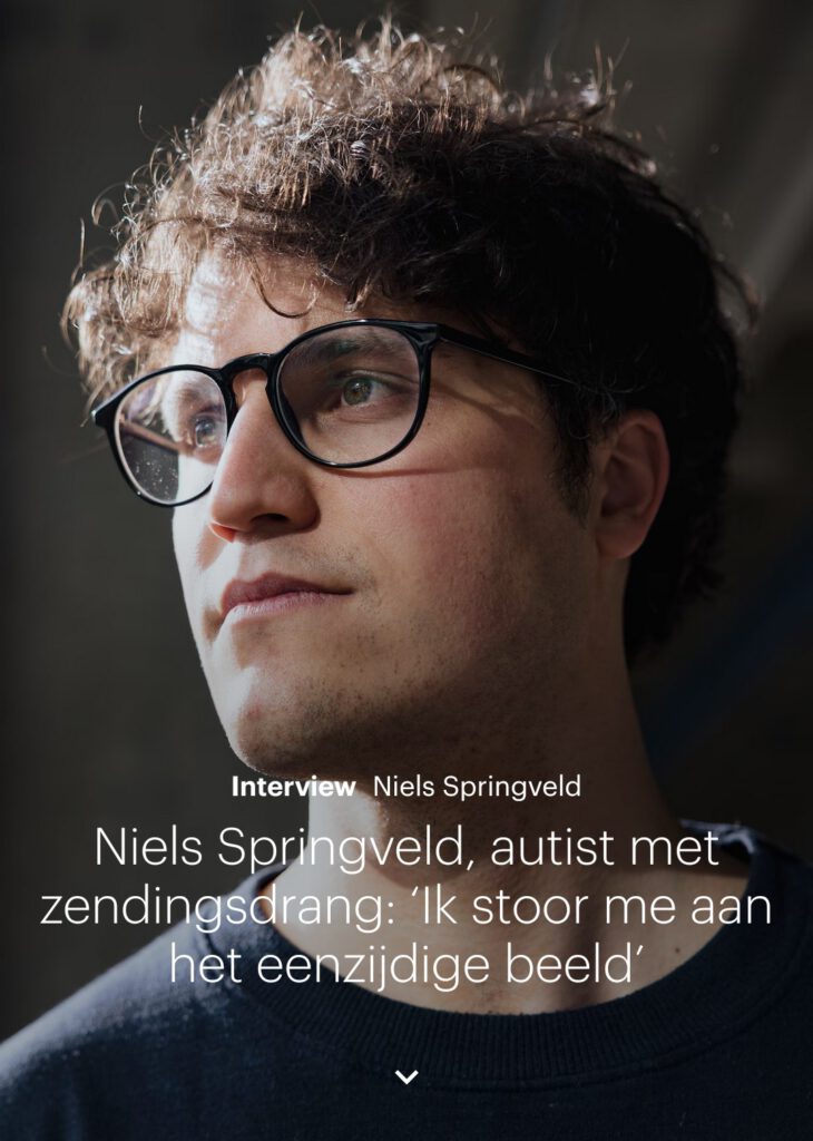 Springveld (33) is historicus en autist ‘van het overpeinzende en zenuwpezige soort’. Het ging niet goed met hem toen hij in 2019 besloot om een geschiedenis van het autisme te schrijven. Diep, diep, diep in een onderwerp duiken, alles lezen wat los en vast zit, die copingstrategie paste hij ook toe bij eerdere ‘zenuwinzinkingen’, zoals hij ze noemt. Om zo weer grip te krijgen op het leven.